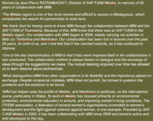 At the end of May, it held a four-day celebration of its 35th year and the 20th of its partnership with MfM, attended by representatives of the two organisations, and Melaky community leaders.